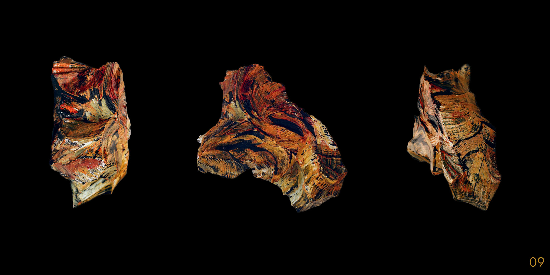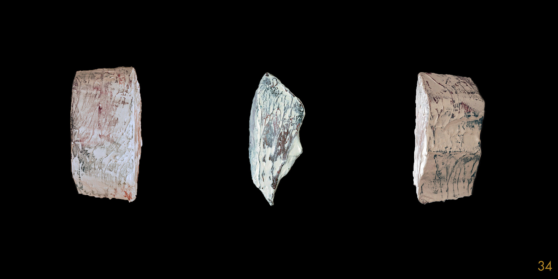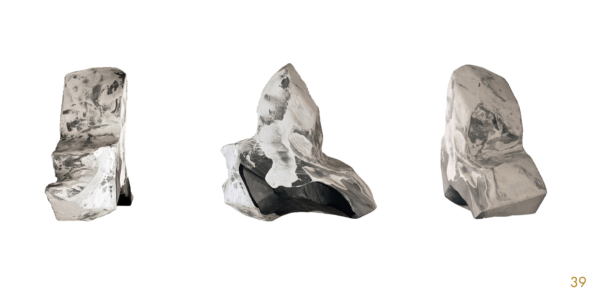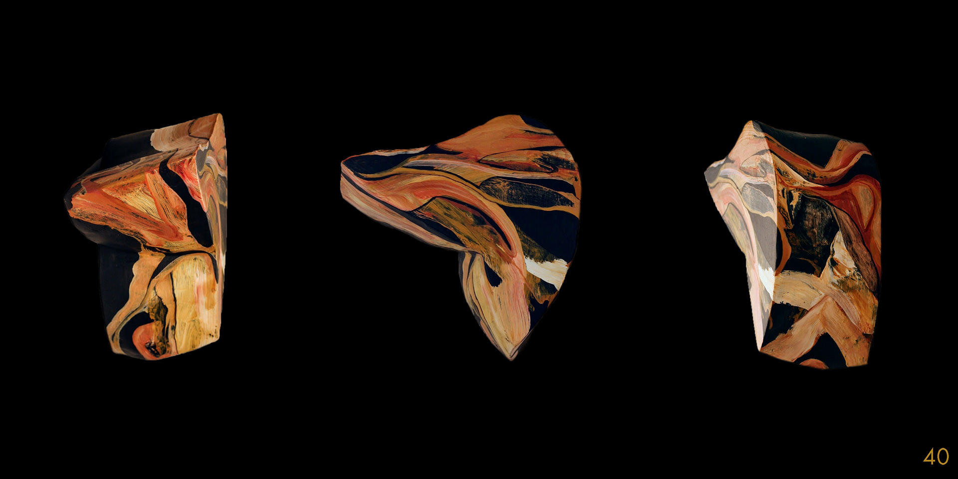 This series and process of making the 40 acrylic on polystyrene forms mimics my own midlife wrestling with mortality, illusion, and imperfection.