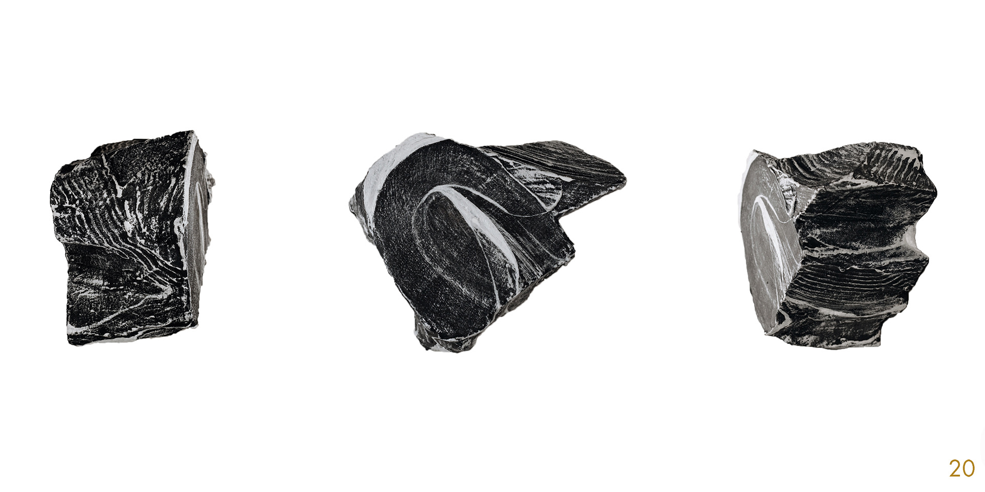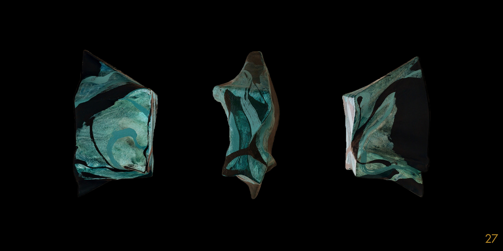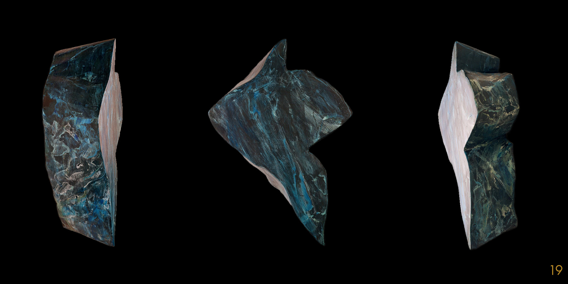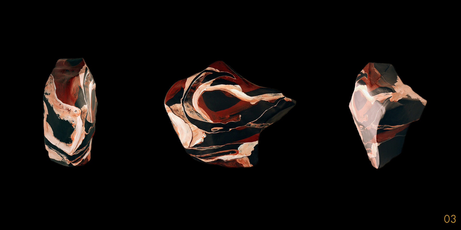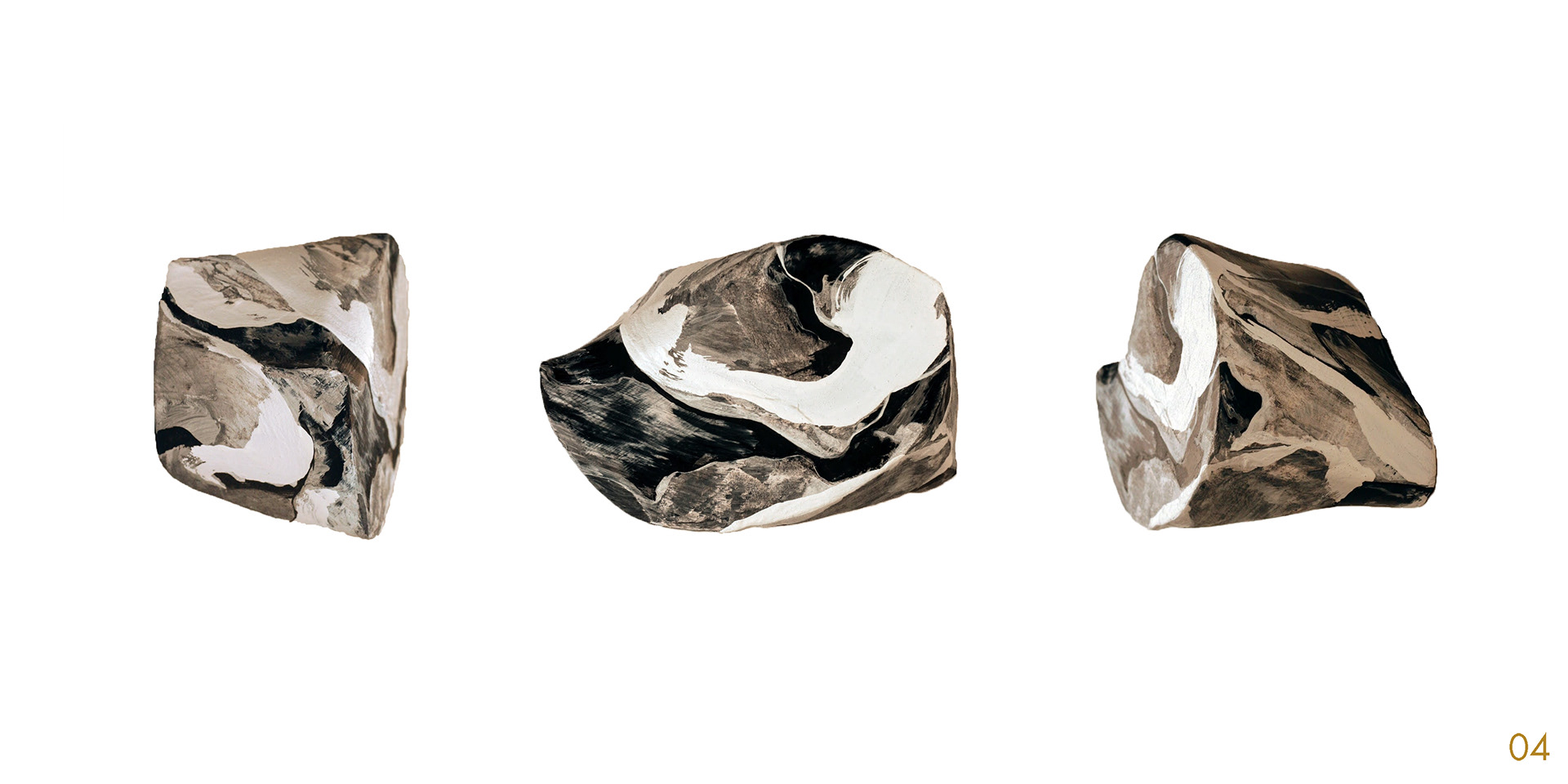 This series and process of making the 40 acrylic on polystyrene forms mimics my own midlife wrestling with mortality, illusion, and imperfection.